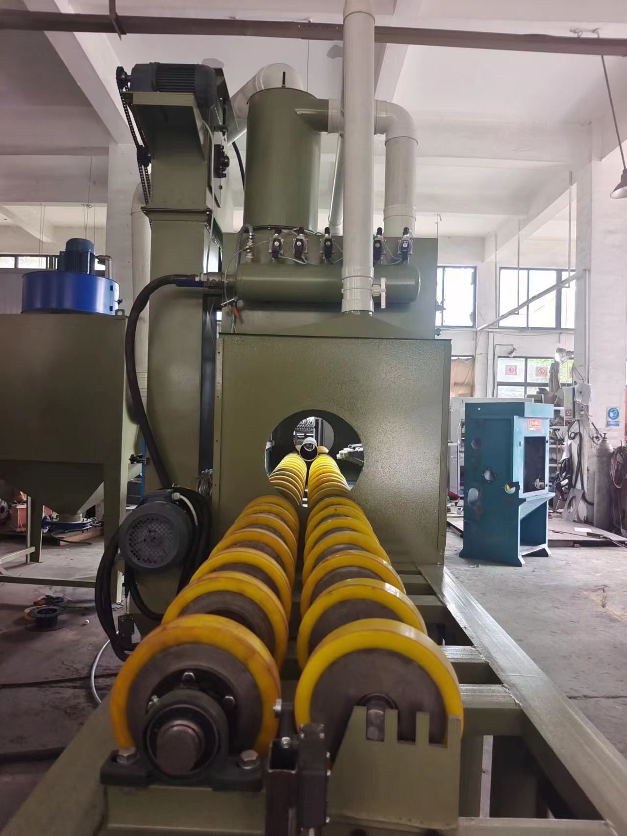 本類(lèi)機(jī)型適用于,管件,輥軸類(lèi)圓柱形工件的表面處理噴砂工藝。 材質(zhì)不限如:鐵管、